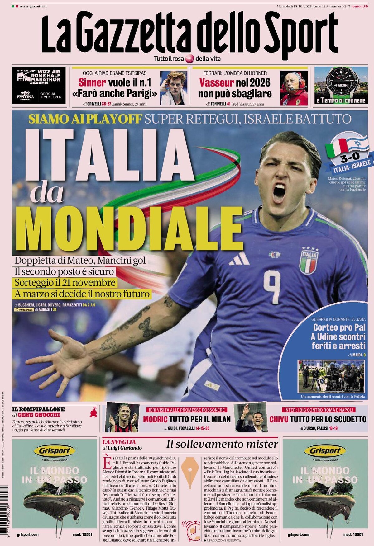 Mancini scored the third goal, 16 goals in four games for Rino. The World Cup qualification must be earned through the playoffs. Clashes and wounded: chaos in Udine.