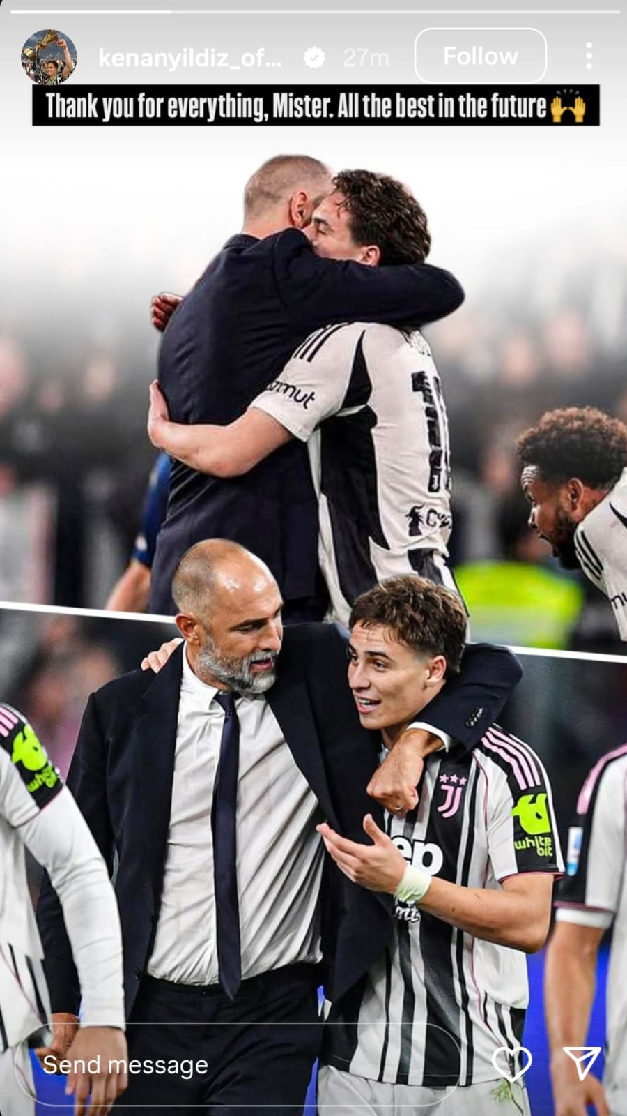 Kenan Yildiz has sent his best wishes to Igor Tudor, who was sacked from his position as head coach of Juventus on Monday: ‘All the best for the future’.